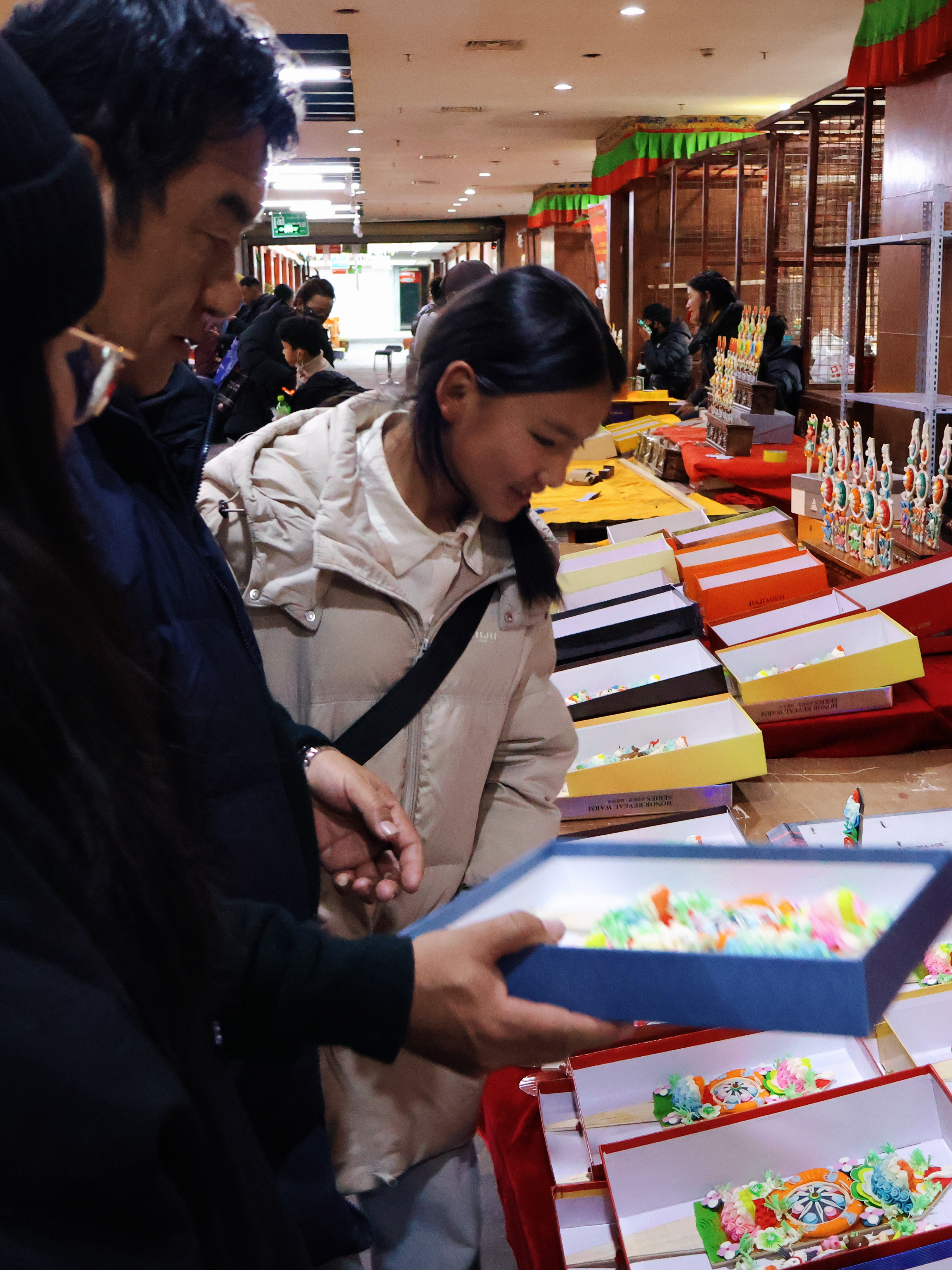 商家拉姆的摊位前,色彩艳丽、造型精美的酥油花整齐摆放,佛像、吉祥八宝、花卉鸟兽等造型栩栩如生,吸引着市民驻足挑选、询价购买。她忙着为顾客打包酥油花,不亦乐乎。